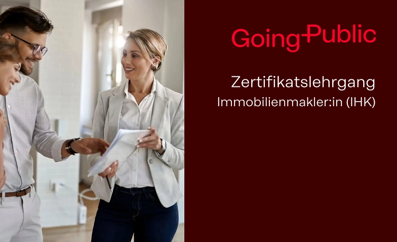 GOING PUBLIC! hat ein Weiterbildungspaket geschnürt, das keine Wünsche offenlässt. Während sich andere Anbieter oft nur auf das reine Makeln beschränken, betrachten wir das Gesamtpaket. Eine qualifizierte Immobilienmaklerin oder ein qualifizierter Immobilienmakler kann mehr. Mit dem Abschluss „Immobilienmakler:in (IHK)“ tragen Sie ein IHK-Zertifikat als Qualitätssiegel.