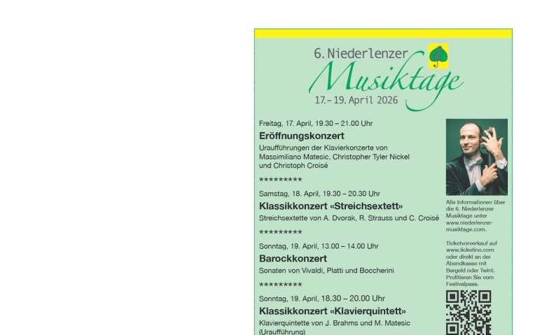 Gala-Eröffnungskonzert Klavierkonzerte Uraufführungen | Friday, 17.04.2026, 19:30 | Reformierte Kirche Nierderlenz, Aargau, 5702 Niederlenz, CH | Tickets | |