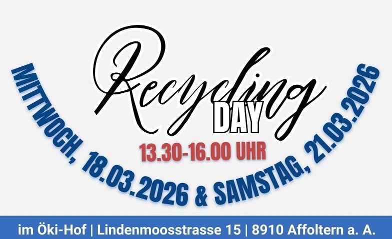 Recycling-Day | Saturday, 21.03.2026, 13:30 | Öki-Hof / Schmid AG Entsorgung und Recycling (blau), Lindenmoosstrasse 15, 8910 Affoltern am Albis, 8910 Affoltern am Albis, CH | Infomation | |