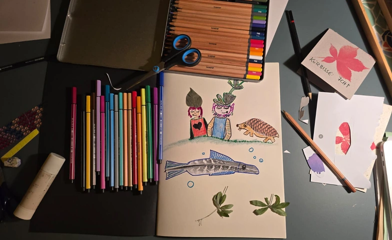 Die Schätze des Waldes dienen als Grundlage für dieses Sonntagsatelier: Ob Walnussschale, Tannenzapfen oder ein Schneckenhaus, was steckt in diesen scheinbar gewöhnlichen Waldgegenständen? Mit Bunt- und Filzstiften werden die Waldformen fantasievoll in Szene gesetzt. So wird aus einer Walnussschale ein Blütenkopf, der Tannenzapfen verwandelt sich in einen stacheligen Igel und das Schneckenhaus wird zum Hut eines scheuen Waldwesens. Alle entstandenen Werke finden Platz in einem kleinen Heft, das zu Hause weiter gestaltet werden darf.