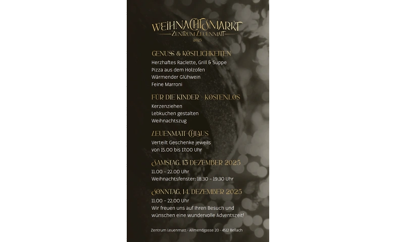 Weihnachtsmarkt Tickets Weihnachtsmarkt Saturday, 13.12.2025, 10:00 Zentrum Leuenmatt, 4512 Bellach, CH Infomation