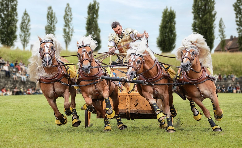 Am Römertag Vindonissa 2026 erleben Besucherinnen und Besucher rasante Wagenrennen und dramatische Gladiatorenkämpfe. Beim Amphitheater Windisch treten römische Streitwagen mit Pferden gegeneinander an. Gladiatoren kämpfen im Jubel der Zuschauermenge um Ruhm und Ehre – ein antikes Spektakel vor historischer Kulisse!