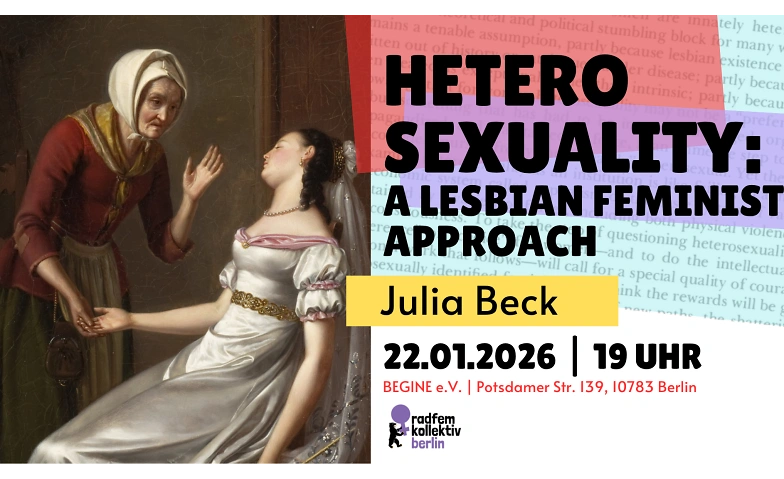 Beim Thema Sexualität geht es nicht nur um die Frage, wen wir lieben. Für Frauen und besonders für Lesben ist das Thema politisch! Wenn wir durch eine feministische Brille einen Blick auf das Thema Sexualität werfen, ergeben sich Fragen wie zum Beispiel "Ist Sexualität gesellschaftlich konstruiert?", "Was ist eine heterosexuelle Frau?" und "Inwieweit ist Separatismus eine Lösung?" Kommt zu einem Abend mit Analyse und Diskussion, inspiriert von Adrienne Richs berühmtem Essay "Compulsory Heterosexuality and Lesbian Existence" / "Zwangsheterosexualität und lesbische Existenz" (1980).