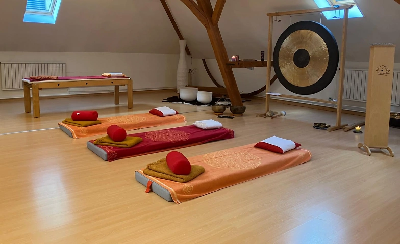 Dazu gehört ein Liegeplatz im Klangraum auf einem Mätteli, ausgestattet mit Decken und Kissen.