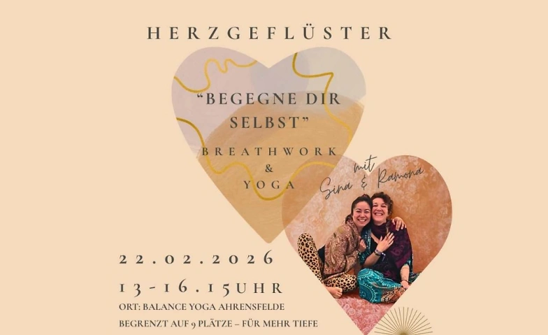 Zwischen Alltag und Erwartungen wird die zumeist leise Stimme unseres Herzens schnell überhört. Herzgeflüster schenkt dir einen Moment zum Innehalten, Spüren und Verbinden. In Begleitung von Ramona & Sina werden Yoga und transformative Atmung zu einer Einladung, wieder bei dir anzukommen – sanft, ehrlich und ohne Druck. Dieser Workshop schenkt dir einen geschützten Erfahrungsraum, in dem deine Bedürfnisse im Mittelpunkt stehen. Sanft begleitet, deine Teilnahme ist ohne Vorerfahrung möglich.