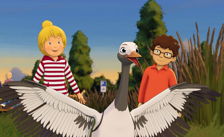 Da fahren Connis Eltern in Meine Freundin Conni – 2 einmal in den Urlaub, und schon stolpert Conni Zuhause über einen verletzten Kranich und in ein neues Abenteuer hinein. Zur Seite stehen ihr dabei ihr Grossvater, ihre Freunde und Kater Mau.