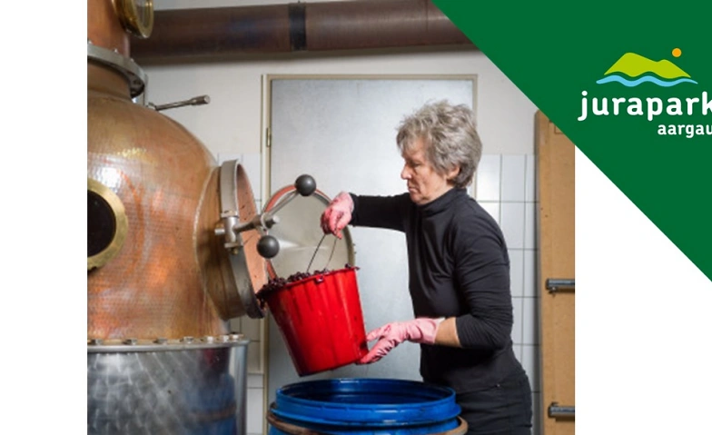 Zum Schluss steht eine exklusive Besichtigung der Brennerei Häseli in Gipf-Oberfrick auf dem Programm. Hier werden die Chriesi zu Jurapark-zertifiziertem Fricktaler Kirsch verarbeitet.