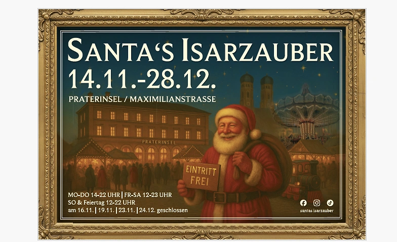 Wenn sich die Praterinsel in glitzernde Lichter hüllt und der Duft von gebrannten Mandeln und frischem Tannengrün in der Luft liegt, beginnt die magische Zeit des Santas Isarzauber. Das historische Gelände an der Isar verwandelt sich in eine stimmungsvolle Weihnachtswelt, die große und kleine Besucher gleichermaßen begeistert. Zwischen festlich dekorierten Ständen, warmem Lichterglanz und gemütlichen Feuerstellen lädt Santas Isarzauber zum Verweilen, Genießen und Entdecken ein. Kunsthandwerker und Händler präsentieren liebevoll gefertigte Geschenkideen, handgemachte Schätze und weihnachtliche Besonderheiten. Für leuchtende Kinderaugen sorgen das nostalgische Kinderkarussell und der tägliche Besuch des Weihnachtsmanns, der in seiner Garage kleine Gäste empfängt, Geschichten erzählt und Wünsche entgegennimmt – unvergessliche Momente voller Magie und Vorfreude. Auch kulinarisch wird es festlich: Von herzhaften Schmankerln über süße Verführungen bis hin zu duftendem Glühwein und kreativen Wintercocktails – hier findet jeder sein Lieblingsaroma. Die stimmungsvollen Lichter spiegeln sich im Wasser der Isar, während Livemusik und weihnachtliche Klänge eine Atmosphäre schaffen, die Herz und Seele wärmt. Ob beim gemütlichen Beisammensein mit Freunden, beim romantischen Spaziergang durch das Lichtermeer oder beim Familienausflug in die festliche Inselwelt: Santas Isarzauber auf der Praterinsel ist ein Ort, an dem die Weihnachtszeit lebendig wird. Ein Ort voller Licht, Genuss und weihnachtlicher Freude – mitten im Herzen Münchens.