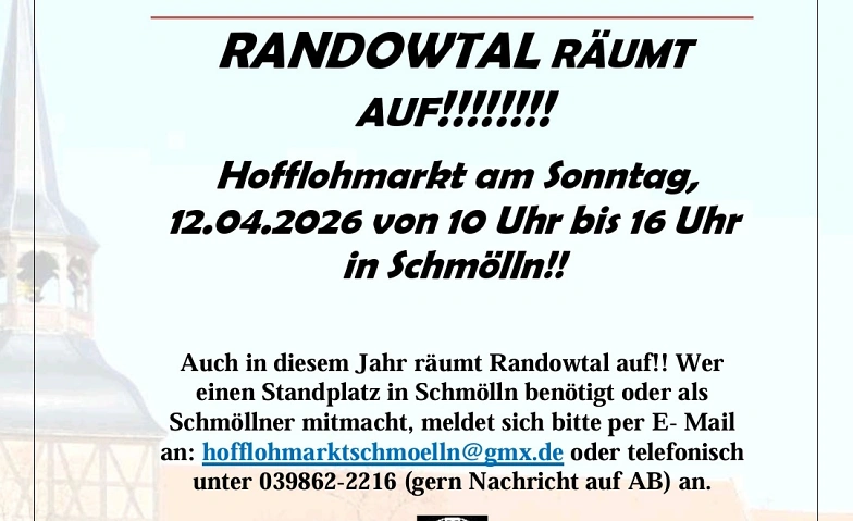 Auch in diesem Jahr räumt Randowtal auf!! Wer einen Standplatz in Schmölln benötigt oder als Schmöllner mitmacht, meldet sich bitte per E- Mail an: hofflohmarktschmoelln@gmx.de oder telefonisch unter 039862-2216 (gern Nachricht auf AB) an.