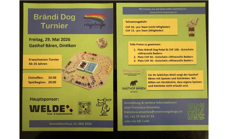 Am Freitag, 29. Mai 2026, lädt der Verein Rägeboge zum Brändi Dog Turnier im Gasthof