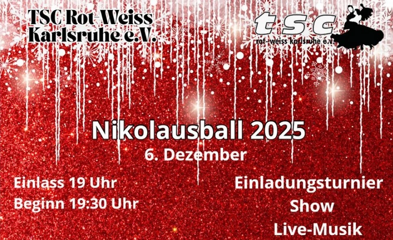 der Tanzsportclub Rot-Weiss Karlsruhe lädt zum Nikolausball am Samstag, den 06. Dezember um 19 Uhr in sein weihnachtlich geschmücktes Clubheim in Karlsruhe-Grünwinkel ein. Das Vereinsheim liegt über dem HIT-Einkaufsmarkt, Eichelbergstr. 34, 76189 Karlsruhe-Grünwinkel: Eingang an der Durmersheimer Straße auf der rechten Seite des Einkaufsmarktes.