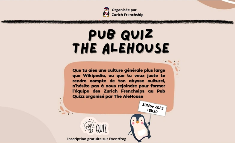 Vous ne l’attendiez pas ! Vous ne le connaissiez pas ! Mais voici l’arrivée du Pubquizz ! 🥳🎉🎉 L’évènement incontournable de Zurich Frenchship sur la culture Générale avec un grand G ! En quoi ça consiste ? C’est très simple ! Tout les derniers dimanches du mois on se donne rdv au Alehouse à 18h30 et on essaie de répondre correctement à des questions de culture G assez compliquées posées en anglais 🏴󠁧󠁢󠁥󠁮󠁧󠁿