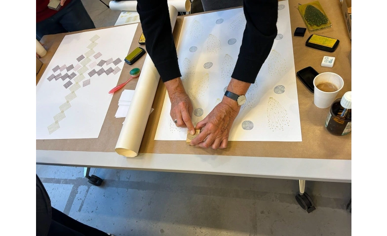 Handdruck-Workshop im Kunstatelier unter dem Dach mit Beat Hosbach von Stempelbox: Experimentieren, entwickeln, gestalten mit Stempel, Farbe und Papier.
