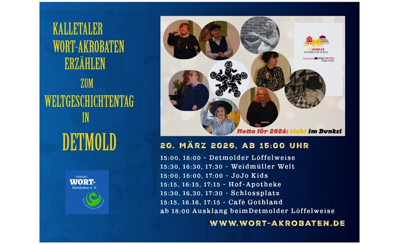KALLETAL / DETMOLD – Wenn Märchenerzähler auf die Straße gehen, werden Grenzen unsichtbar. Unter dem diesjährigen Welt-Motto „Licht im Dunkel“ präsentieren die Kalletaler Wortakrobaten e. V. am 20. März die jahrhundertealte Tradition des freien mündlichen Erzählens in der Innenstadt von Detmold.
