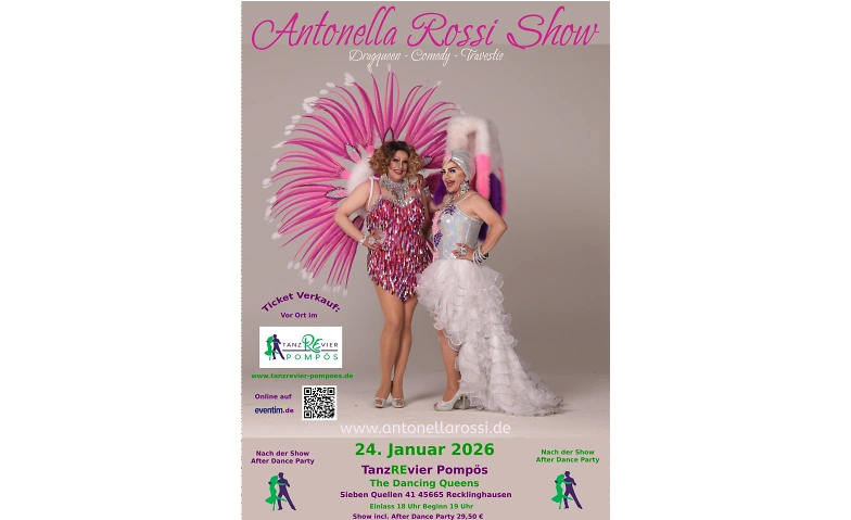 Am 24. Januar 2026 ist es so weit. Dan öffnet sich der Vorhang in der Tanzschule TanzRevier in der Sieben Quellen 41 in Recklinghausen. Der große Tanz Saal wird dann unter dem Motto "Dancing Queens" in einem Revue Haus verwandeln. Antonella Rossi wird mit ihrer Show viel Glamour und Glitzer mitbringen. Wer ihre Shows kennt, weiß wie viel Federn und Strass im Gepäck sind und die Stilettos werden glühen. Der Ticket Verkauf ist schon gestartet. Tickets kosten 29,50 € incl. Show und Party. Tickets gibt es direkt im TanzRevier oder bei Eventim. Einlass ist um 18 Uhr und Show Beginn um 19 Uhr. Danach dürfen die Gäste selber das Tanzbein über das Parkett schwingen, denn nach der Show geht es weiter mit einer After Dance Party. Adresse ist TanzRevier  - Sieben Quellen 41 - 45665 Recklinghausen. Weitere Informationen zur Show gibt es unter: www.antonellarossi.de.