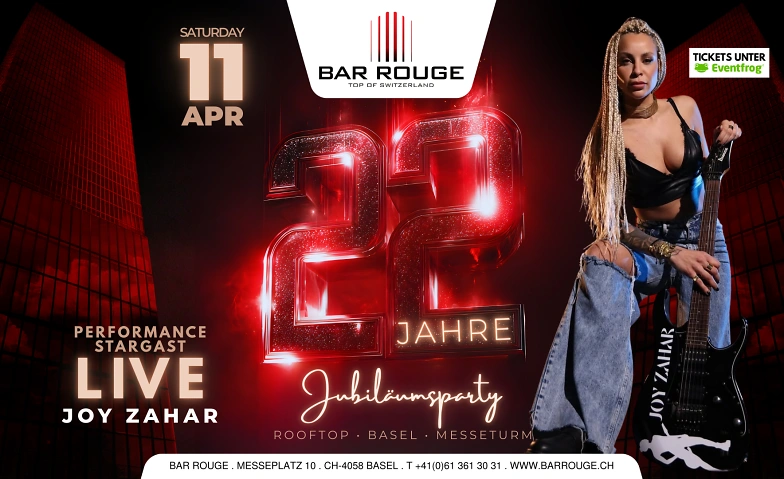 Feiert mit uns ein spektakuläres Jubiläum – 22 Jahre Bar Rouge! Am Samstag, 11. April 2026, entzündet DJane, Gitarristin und Drum Queen Joy Zahar mit einer einzigartigen Show, die Sound, Stil und Feuer verbindet, die Nacht.