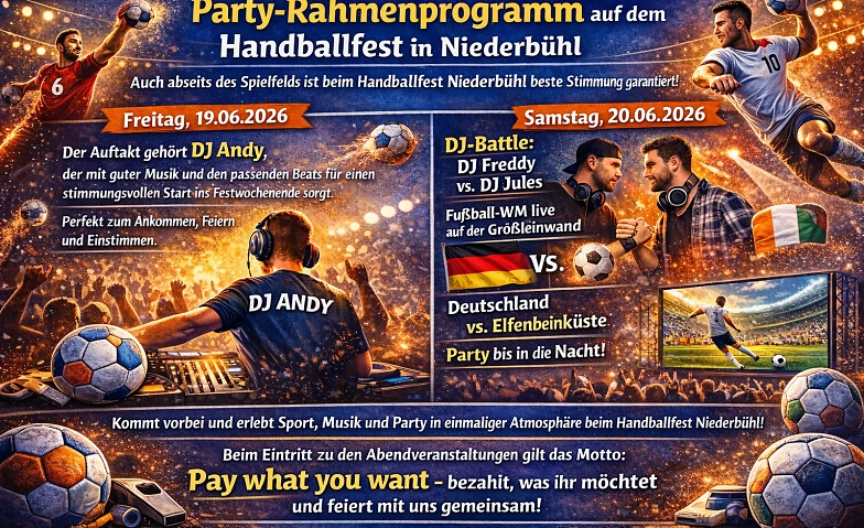 Nach dem Spiel geht die Party nahtlos weiter und wir feiern bis in die Nacht. Kommt vorbei und erlebt Sport, Musik und Party in einmaliger Atmosphäre beim Handballfest Niederbühl!