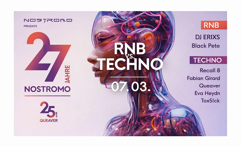 Samstag den 07.03. erwartet euch eine unvergessliche Nacht im Nostromo. Seid dabei, wenn sich die besten Sounds aus verschiedenen Musikrichtungen vereinen. Auf zwei Floors könnt ihr euch auf mitreißende RnB-Beats und treibenden Techno freuen. Erlebt die Energie und Vielfalt der Musikszene, während talentierte Acts die Menge in Ekstase versetzen. Feiert mit uns eine Nacht voller Rhythmus, Leidenschaft und unvergesslicher Momente! Seid am Start und lasst euch von den besten Sounds der Stadt verzaubern!