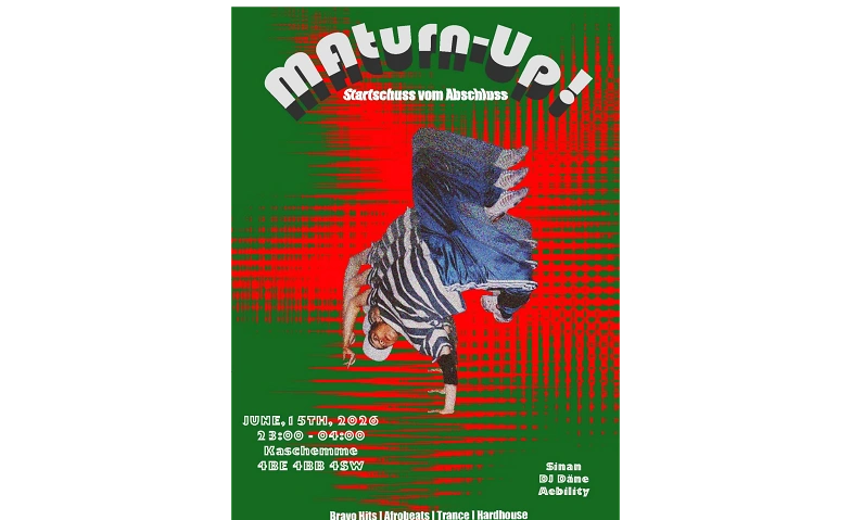 Unseri Maturparty in dr Kaschemme isch dr Startschuss vom Abschluss. Miteme schöne Garteberich und gueter Musik fiire mir unseri hart erkämpfti Matur. Drei verschiedeni DJs legge alles vo Bravo- Hits bis Afrobeats, Trance und Hardhouse uf. D Party goht vo 23:00 bis 4:00. Also liggts jetz an euch: Turn Up!!!