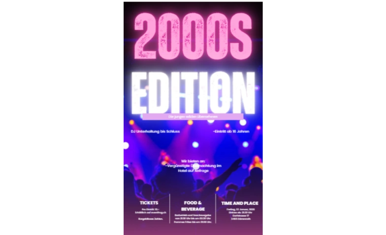Die jungen wilden übernehmen den Lead - Erlebe eine Partynacht mit den grössten Hits aus den 2000s, Barbetrieb, Snacks, coolen Outfits und guter Stimmung in unserem Belle Epoque Saal.