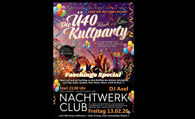 steigt die große Ü40 Faschings-Kultparty im Nachtwerk Club mit DJ Axel & einer bunten Mischung der Kulthits der letzten Jahrzehnte aus Pop, Rock, Synthie, New Wave, Disco, Funk & Soul 💃🕺🤸🍹🍻