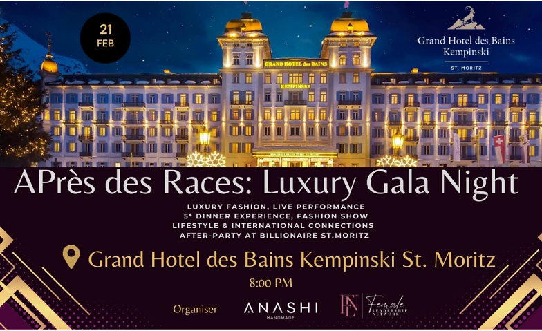 Hosted at the iconic Grand Hotel des Bains, Kempinski St. Moritz, The Après des Races Luxury Dinner Soirée promises an unforgettable night set amidst snow-covered peaks, shimmering lights, and the timeless prestige of St. Moritz at its most magical.