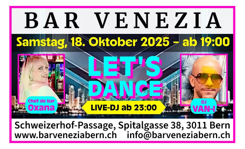 Tanzen und feiern – und dazu Drinks und Erfrischungen des Bar Venezia Teams geniessen. DJ VAN-I sorgt unter dem Motto Let's Dance für beste Stimmung.
