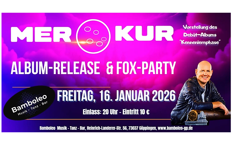 Seid dabei, wenn MERKUR sein Debütalbum exklusiv im Bamboleo Göppingen feiert! Ein Abend voller guter Musik, Tanz und Schlagerherz.