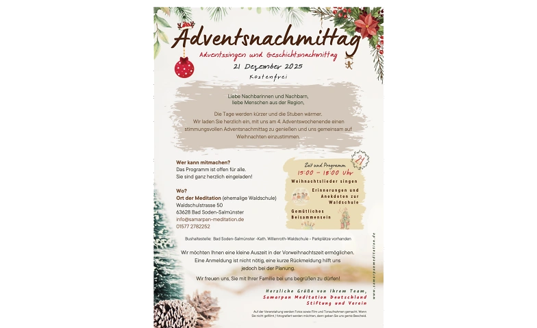 Am Sonntag, den 21. Dezember 2025 (4. Advent), ab 15:00 Uhr wird unser 4. Adventssingen sowie der diesjährige Geschichtsnachmittag am Ort der Meditation stattfinden.