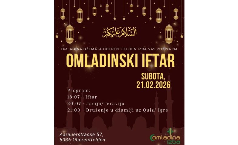 Pozivamo svu omladinu iz Švicarske na naš iftar u IZBA Oberentfelden. 🌙
