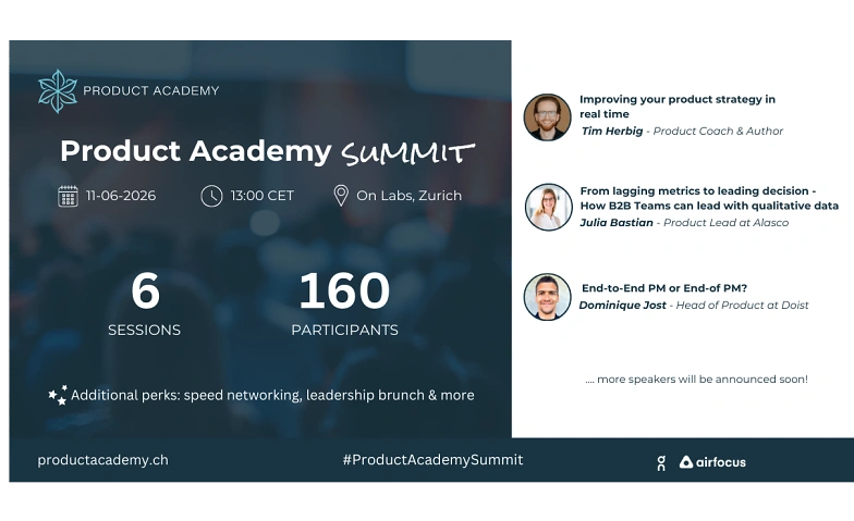 Get ready for the Product Academy Summit - a PM event you don’t want to miss! Join us on June 11, 2026 in Zurich for a day filled with valuable insights and innovation.