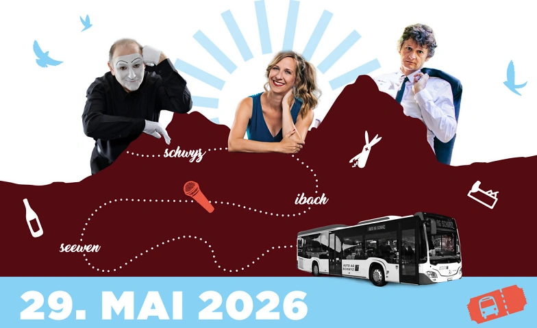 Am 29. Mai 2026 sind die Busse der Auto AG wieder unterwegs und chauffieren unser Publikum an drei Tatorte des Humors: Es sind dies das atmosphärische Besucherzentrum der Schuler Weine, der neu eröffnete Kultturm (beide in Seewen) sowie die beeindruckende EWS-Netzhalle in Ibach.
