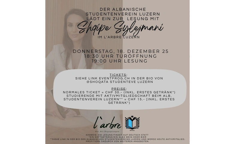 Die Verbindung dieser beiden Geschichten, der neue Roman von Shqipe Sylejmani und die einzigartige Bar von Arberije Kurath, weckte bei Delvina Morina, Gründerin des Albanischen Studentenvereins in Luzern, die Idee einer Synergie. Sie ergriff die Initiative und bringt die beiden Powerfrauen nun zusammen. Der Albanische Studentenverein Luzern lädt euch herzlich ein, das neue Werk von Shqipe Sylejmani in einer Lesung im L’Arbre in Luzern kennenzulernen.