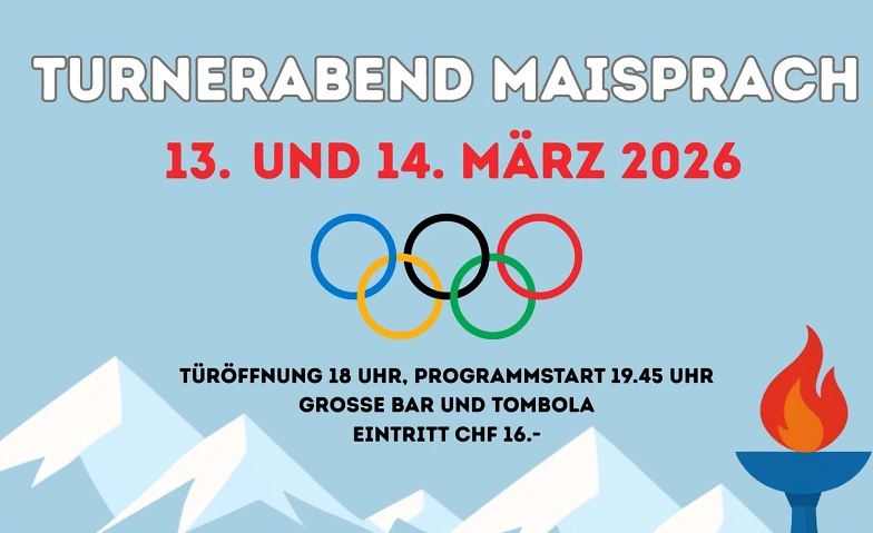 Die turnenden Vereine von Maisprach laden herzlich zum Turnerabend Maisprach 2026 ein. Erleben Sie einen unterhaltsamen und lustigen Abend mit unserer Unterhaltung, welches Sie durch das Programm führen wird. Geniessen Sie Turn- und Tanzvorstellungen der Vereine von Jung bis Alt. Vor und während dem Anlass verpflegt unsere Wirtschaft Sie mit gerne mit Speiss und Trank.