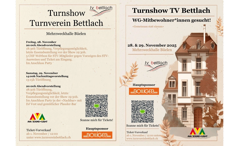 Turnshow TV Bettlach Freitagabend | Friday, 28.11.2025, 20:00 | Mehrzeckhalle Büelen, 2544 Bettlach, CH | Tickets | |
