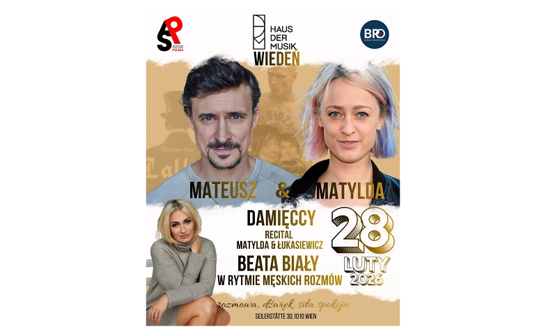 W RYTMIE MĘSKICH ROZMÓW – WIEDEŃ Mateusz Damięcki & Matylda Damięcka recital: Matylda / Łukasiewicz  Zapraszamy na wyjątkowy wieczór rozmowy i muzyki w samym sercu Wiednia — spotkanie, które łączy autentyczny dialog, emocje i sztukę. Gośćmi wydarzenia będą Mateusz Damięcki i Matylda Damięcka — artyści znani z odwagi, wrażliwości i szczerości. Ich rozmowa to coś więcej niż wywiad: to refleksja nad relacjami, emocjami, współczesną męskością i odpowiedzialnością — bez uproszczeń, bez masek, bez pośpiechu. Muzyczną częścią wieczoru będzie kameralny recital duetu Matylda / Łukasiewicz — projektu tworzonego przez Matyldę Damięcką (wokal, teksty) oraz Radka Łukasiewicza (muzyka, produkcja). Ich twórczość balansuje między piosenką, recytacją i manifestem — jest intensywna, poruszająca i bliska widzowi. To jedno z najciekawszych zjawisk współczesnej polskiej sceny alternatywnej. Rozmowę poprowadzi Beata Biały — dziennikarka i pisarka, autorka bestsellerowej serii „Męskie gadanie”. Jej styl rozmowy tworzy bezpieczną przestrzeń do mówienia o emocjach, relacjach i tym, co naprawdę ważne. Podczas wydarzenia będzie możliwość zakupu książek „Męskie gadanie” – część I i II, a po spotkaniu zaplanowany jest czas na autografy i rozmowy z autorką. To nie jest klasyczny koncert ani standardowe