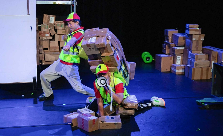 Im Stück «Bon App!» tauchen wir in die stressige Realität von Frank und Carlos ein, die für den Lieferservice «Super Blitz» arbeiten. Jede Minute kommen Bestellungen rein, im Lager stapeln sich Pakete und die Fertiggerichte müssen sofort geliefert werden.