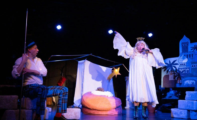 Mit mehr oder minder heiligem Ernst, mit viel Schwung und Sympathie und – wenn es doch etwas komplizierter wird – mit ein bisschen Improvisation zeigen zwei Schauspieler ihre ganz eigene Version der Weihnachtsgeschichte. Begleitet werden sie von einer befreundeten Opernsängerin, die für die richtige Atmosphäre sorgen soll; doch der fehlt es ganz offensichtlich an Talent, Übung und Pünktlichkeit. Das tut dem Elan keinen Abbruch. Dargestellt wird das gesamte Personal aus der Bibel, allerdings mit einer ganz eigenen Charakterisierung der Figuren: die frustrierte Tempelmagd Maria, der Zimmermann Josef und der Erzengel Gabriel, jede Menge Römer, tumbe Schäfer, die drei Weisen aus dem Morgenland, die Hebamme Josefine und viele andere mehr.