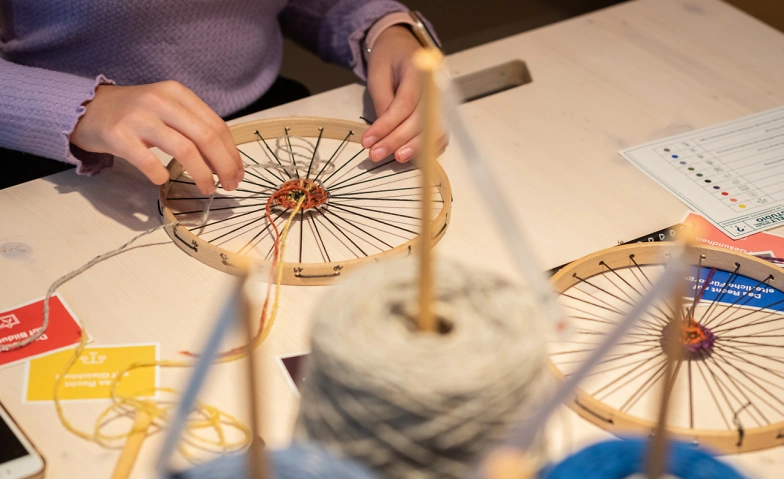 Im WELTSTUDIO steht ein riesiger Webstuhl, der Fadenkartograph, an dem die Besuchenden gemeinschaftlich einen Teppich weben. Entdeckt das Weben auf kleinen und großen Webrahmen und gestaltet eigene kleine Webstücke, die ihr anschließend mit nach Hause nehmen könnt.