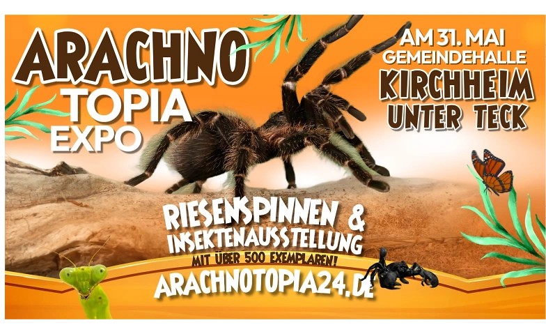 Am 31. Mai 2026 gastiert die Spinnen- und Insektenausstellung in der Gemeindehalle Jesingen in Kirchheim unter Teck. Die Veranstaltung bietet Besucherinnen und Besuchern die Möglichkeit, die vielfältige und oft verborgene Welt der Wirbellosen aus nächster Nähe kennenzulernen.