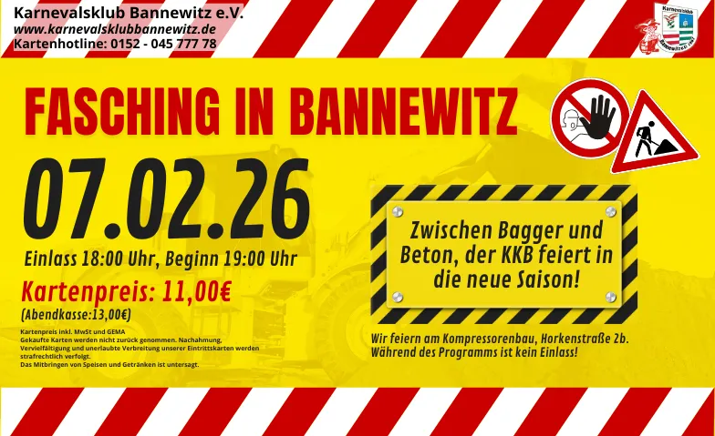 Der Karnevalsklub Bannewitz lädt ein zur 58. Saison unter dem Motto: "Zwischen Bagger und Beton feiert der KKB in die neue Saison"! Die Termine für die vier Faschingsveranstaltungen sind wie folg: 31.01.26, 07.02.26, 14.02.26 und 21.02.26 An allen Veranstaltungstagen ist ab 18 Uhr Einlassbeginn, 19 Uhr beginnt unser Programm. Während des Programms gibt es keinen Einlass! (ca. 19-20 Uhr)