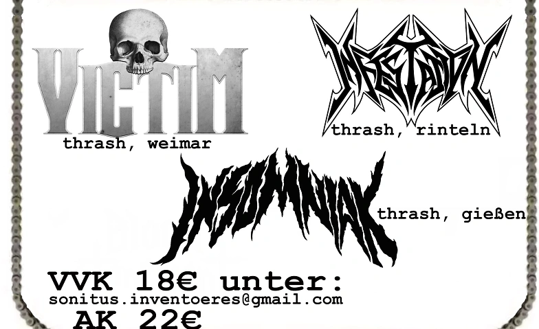 Die Members des Sonitus Inventöres HMFC machen sich wahrlich keine ernsthaften Sorgen bei diesem Billing, sondern ganz im Gegenteil. Denn drei unbedingte Thrash Newcomer treten an, um mit ihrer definitiven Durchschlagskraft die Matten der Banger kreisen zu lassen. Zuerst werden die Fans eine deftige Watsche von INSOMNIAK aus Gießen bekommen. Weil bei den energiegeladenen Liveshows des Trios derbe abgefeiert wird, und der neue Track „The Nekkbreaker“ alles kann, mussten die Veranstalter diese Band nach Essen einladen. Die drei Hessen werden liefern, das Don’t Panic Gemäuer wird Risse bekommen.