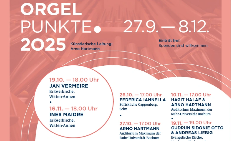 Ab September (27.09. bis 08.12.2025) porträtiert der Freundeskreis zur Förderung der Orgel- und Kammermusik e.V. in der Konzertreihe "Bochumer Orgelpunkte 2025" besondere westfälische Orgeln.