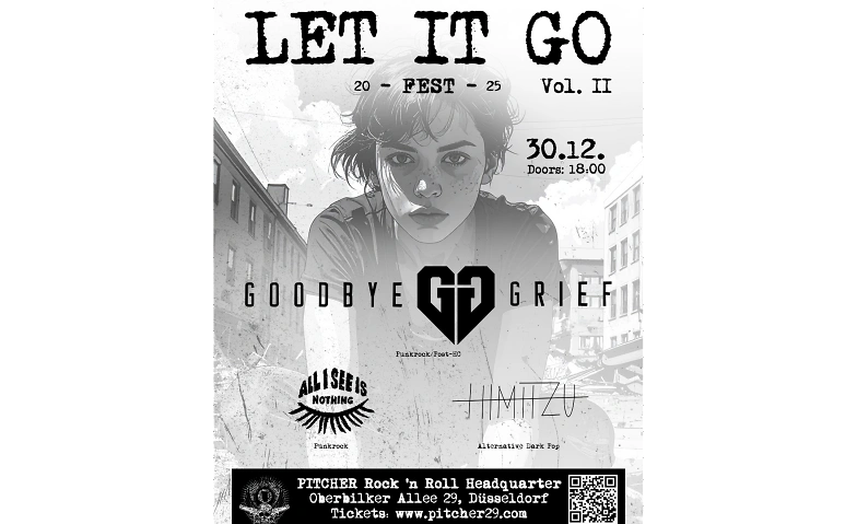 Goodbye Grief (DUS), HIMITZU (DUS, Ruhrgebiet) und All I See Is Nothing (DUS) liefern an diesem Abend den perfekten Soundtrack dazu. Drei Bands mit Tiefgang und Herzblut, die ihre Leidenschaft für Punkrock, Post-HC, Alternative Dark Pop und Indie mal in melancholischen, mal in zuversichtlichen Songs zum Ausdruck bringen.