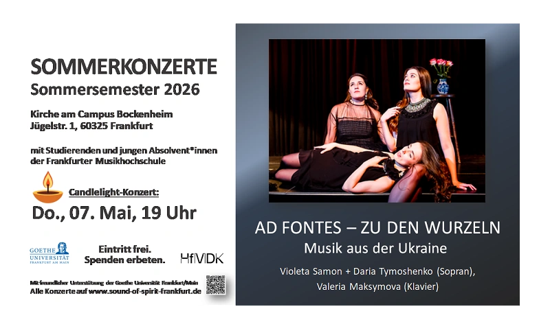 Donnerstag, 7. Mai, um 19 Uhr, findet in der Kirche am Campus Bockenheim, Jügelstraße 1, 60325 Frankfurt, im Rahmen der Sommerkonzertreihe 2026 mit Studierenden der Frankfurter Musikhochschule (HfMDK) ein weiteres Konzert statt. Unter dem Titel „Ad fontes (Zu den Wurzeln) – Musik aus der Ukraine“ erwartet das Publikum ein stimmungsvolles Candlelight-Konzert.