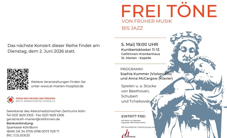 Frei Töne - Benefizkonzert am 05.05.2026 um 19.00 Uhr Cellitinnen-Krankenhaus St. Marien (Kapelle), Kunibertskloster 11-13, 50668 Köln Billets