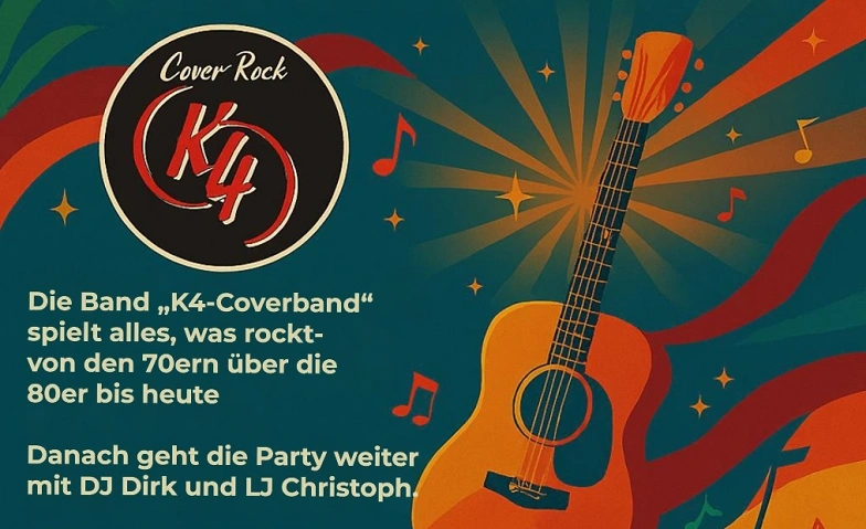 Die Band „K4-Cover Rock“ spielt alles, was rockt, von 70er Jahren über die 80er bis heute. Danach geht die Party weiter mit DJ Dirk und LJ Christoph