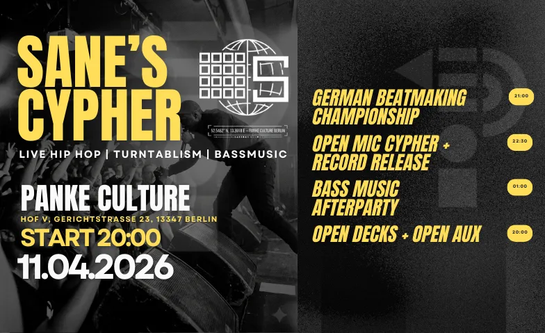 2 Stunden Cypher Madness Die Urban Rap Session Crew um Sane's Medicine und Deejay O ist zurück und liefert das Herzstück des Abends. Gehostet von dem unvergleichlichen Duo Abba Lang und Stan Valdez, öffnen wir die Bühne für euch. Komm auf die Stage, drop deine besten Bars und werde Teil der energiegeladensten Cypher Berlins!