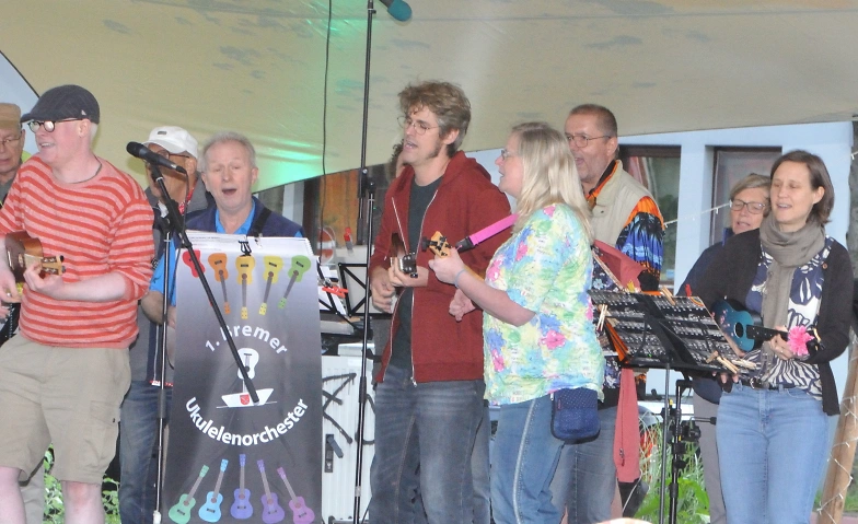Seit 2012 ist das 1. Bremer Ukulelenorchester1BUO auf Bühnen, Straßen und Plätzen in und um Bremen unterwegs mit Songs aus diversen Jahrhunderten, Kontinenten, Stilrichtungen, Ton- und Taktarten, meist mit mehrstimmigem Gesang. Nur bei der Instrumentierung sind wir recht einseitig: alles Ukulelen :-), abgesehen vom Bass (die Riesenukulele) und gelegentlich mal ein Ergänzungsinstrument. Was dabei herauskommt ist eine wilde Mischung aus Sea Music, Pop, Country, Folk und Rocksongs. Auf jeden Fall große Stimmung mit kleinen Instrumenten, zum Mitsingen, Mitschnippen, Mittanzen. Der Eintritt ist frei, um eine Spende wird gebeten.