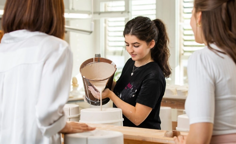 Neben dem Garnieren von Blüten und Buchstaben, Formen und Modellieren einzelner Elemente, Handwerkskunst die Sie eventuell aus dem Kreativworkshop der Vasengestaltung bereits kennen, kommt nun das Gießen der flüssigen Porzellanmasse in authentische Formen hinzu, sowie das eigenhändige Ansetzen des Henkelgriffs an die Karaffe.